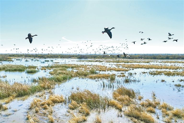 大批候鳥在藍(lán)天與濕地間自由翱翔?! ?/span>