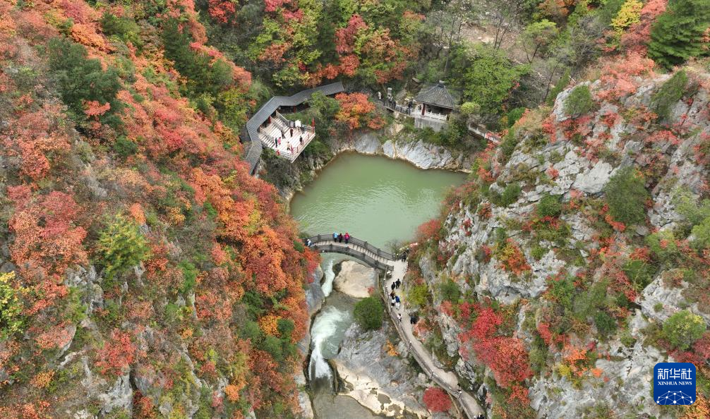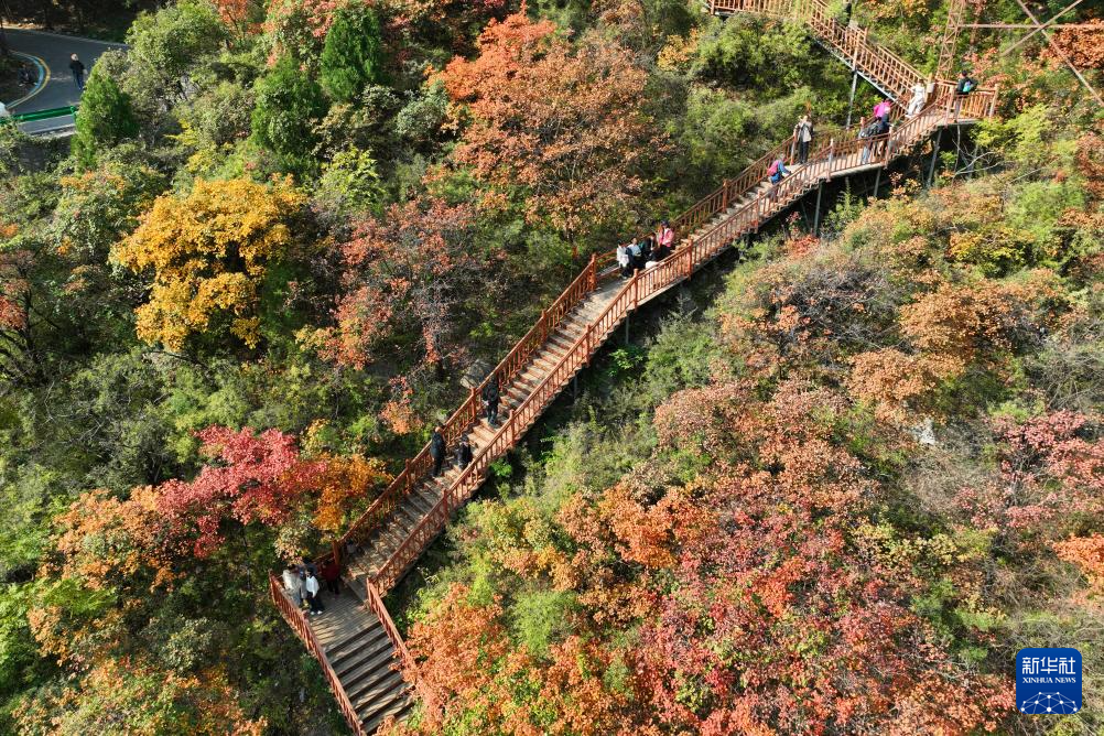 11月2日,游客在河南省沁陽(yáng)市神農(nóng)山景區(qū)賞紅葉(無(wú)人機(jī)照片)。