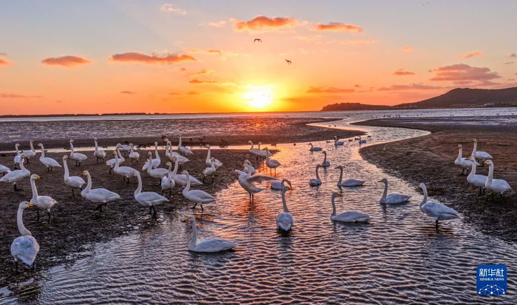 11月2日,在山東省榮成市成山鎮(zhèn)天鵝湖濕地,大天鵝在棲息、覓食(無(wú)人機(jī)照片)。