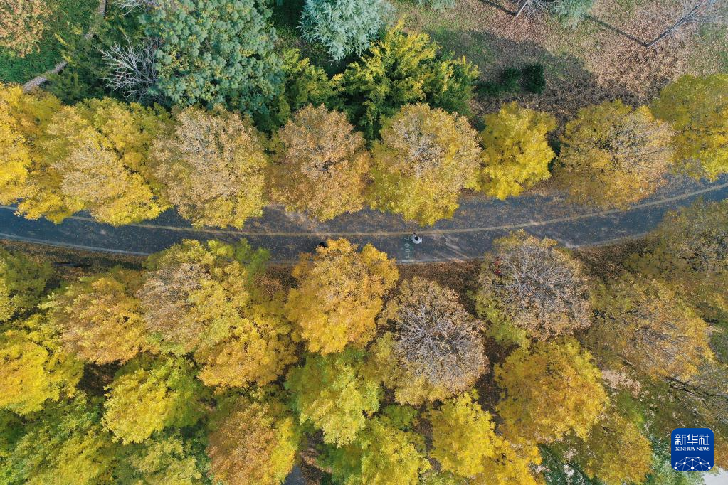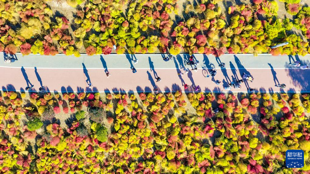 11月2日,游人在天津市濱海新區(qū)的白鷺洲公園賞秋游玩(無(wú)人機(jī)照片)。