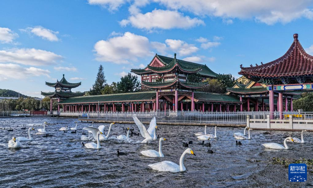 11月2日,在山東省榮成市成山鎮(zhèn)西霞口隆霞湖公園,大天鵝在棲息、覓食(無(wú)人機(jī)照片)。