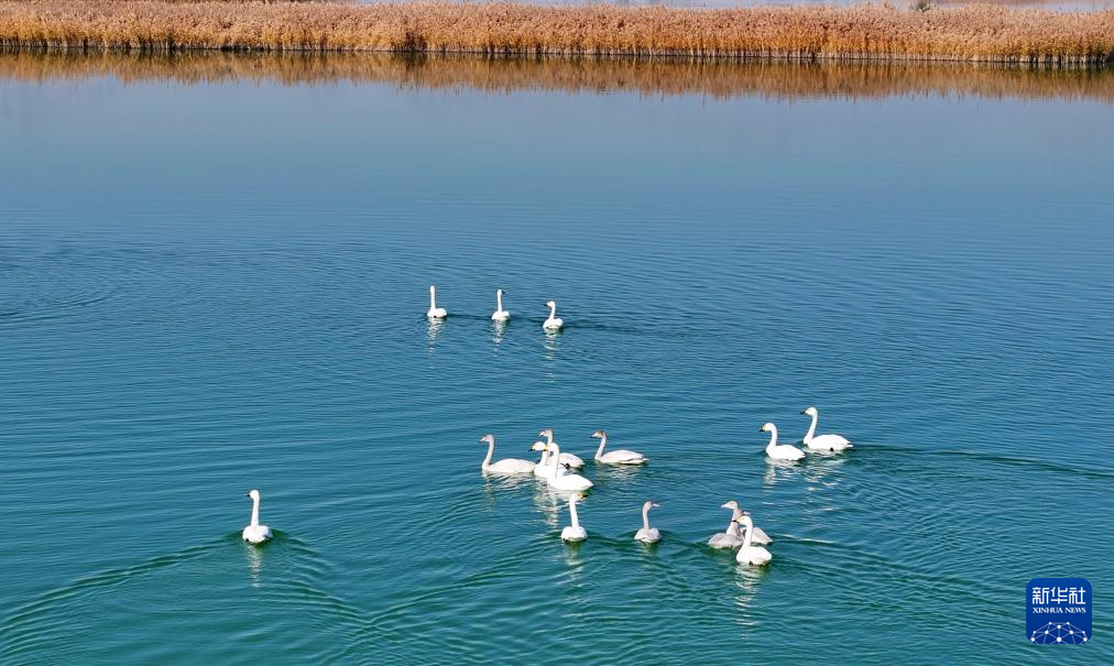 候鳥在寧夏銀川市西夏區(qū)犀牛湖游弋(無(wú)人機(jī)照片,11月2日攝)。