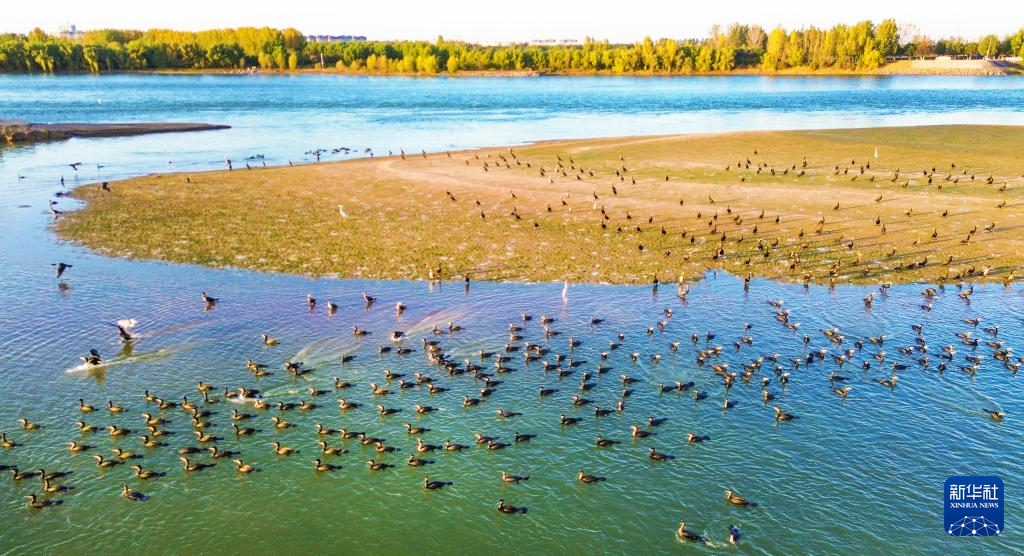 11月1日,一群水鳥在位于河南省洛陽(yáng)市孟津區(qū)境內(nèi)的黃河濕地國(guó)家級(jí)自然保護(hù)區(qū)嬉戲(無(wú)人機(jī)照片)。