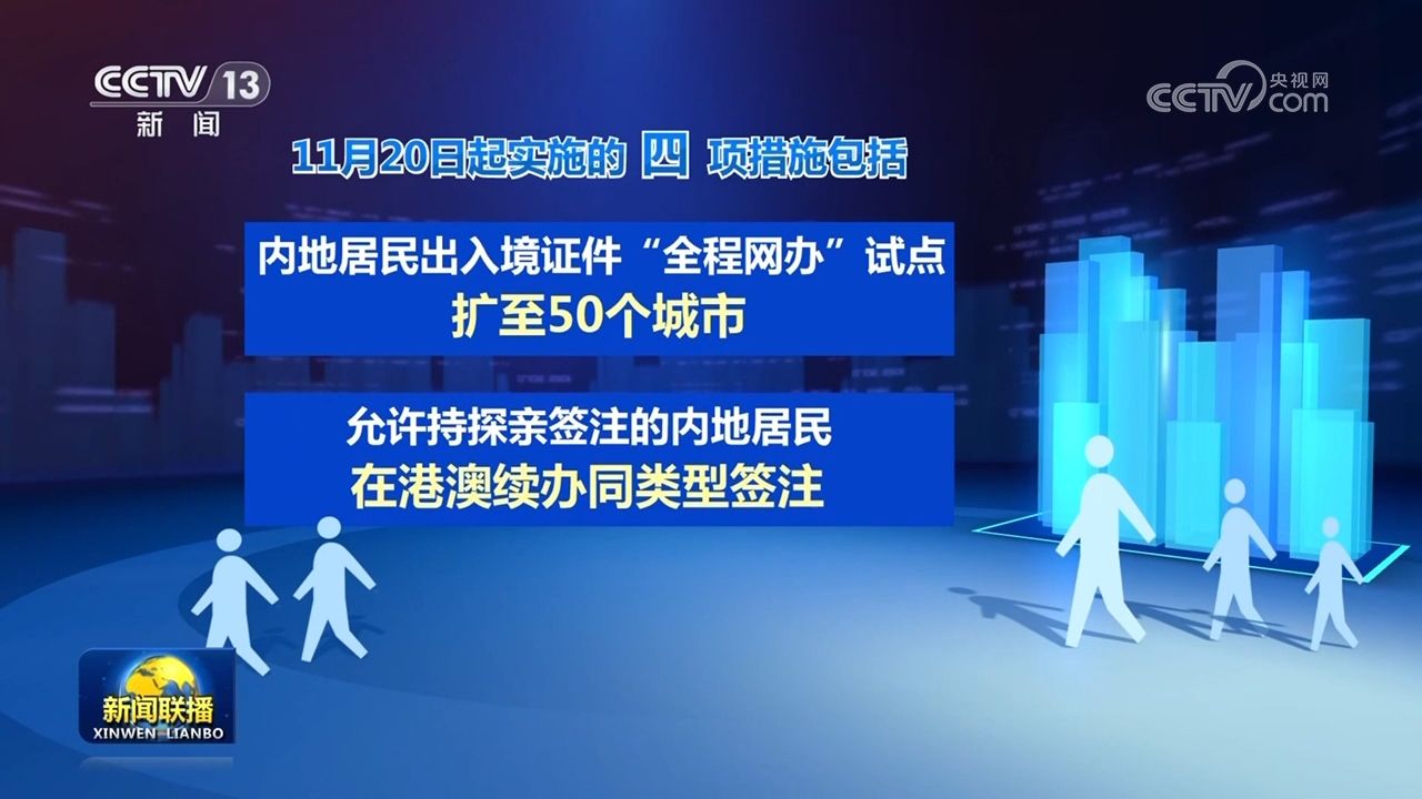 11月20日起開始實施的4項措施包括:內地居民出入境證件“全程網(wǎng)辦”試點擴至50個城市;允許持探親簽注的內地居民在港澳續(xù)辦同類型簽注;可簽發(fā)一次有效臺胞證的口岸由58個增至100個;外國人入境卡可通過多種線上渠道提前填報。